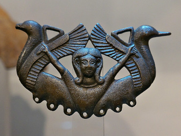 The necklace with carved pendants is a sixth century BC addition and may be from Cyprus.