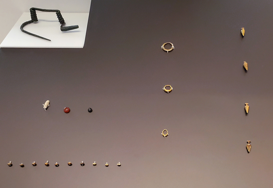 Double-spring bronze fibula (pin) to secure a cloak, gold earrings, pendants and necklace beads
