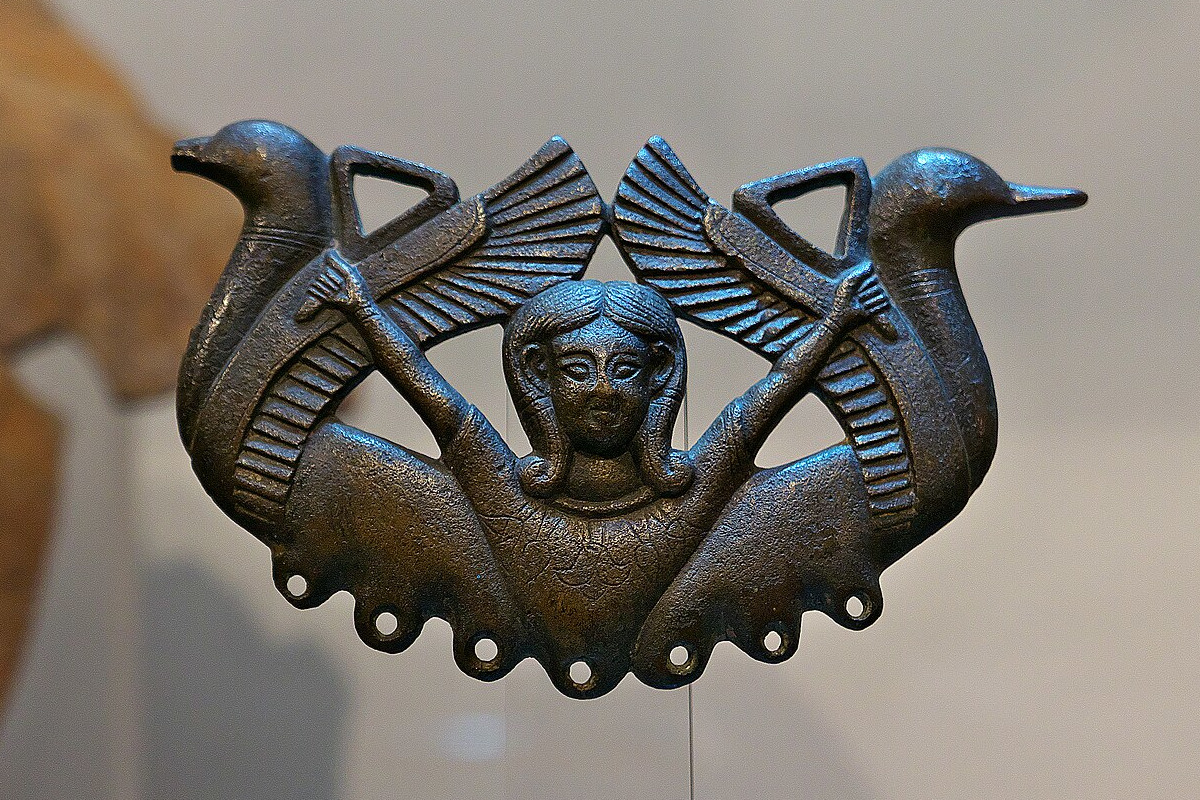 The necklace with carved pendants is a sixth century BC addition and may be from Cyprus.