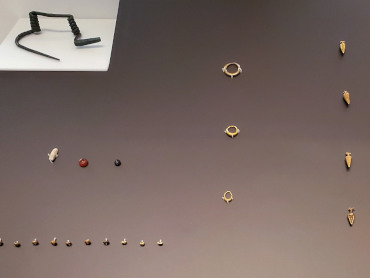 Double-spring bronze fibula (pin) to secure a cloak, gold earrings, pendants and necklace beads
