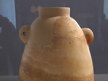 Delicate alabaster urn that carried the ashes, made in an Egyptian workshop.